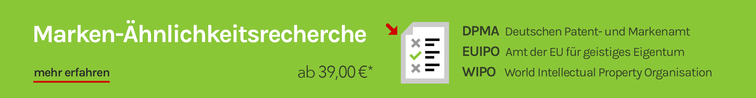 Die erweiterte Identitätsrecherche wird in den für Deutschland relevanten Markendaten (DPMA, EUIPO & WIPO) durchgeführt. Das Ergebnis enthält neben identischen auch Treffer mit bestimmten Ähnlichkeiten, ersetzt aber keine vollständige Ähnlichkeitsrecherche.